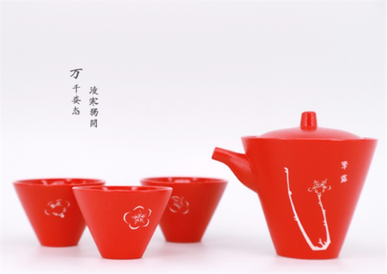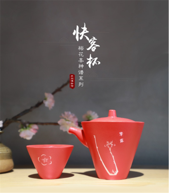 苏州博物馆所出品的《梅花喜神谱》系列中,在今年最受欢迎的就是这款梅花喜神谱快客杯,其设计灵感来自宋代宋伯仁所撰绘的画谱《梅花喜神谱》。梅花喜神谱快客杯由一壶三杯构成,分红黑两款,这一套器具杯身上以宋伯仁绘制的梅花造型而雕刻,将古人绘画技法用现代技术还原于产品之上,体现原谱刻本的特征。除了产品形态,其方便性与实用性,更是让许多年轻人,对这款产品爱不释手。