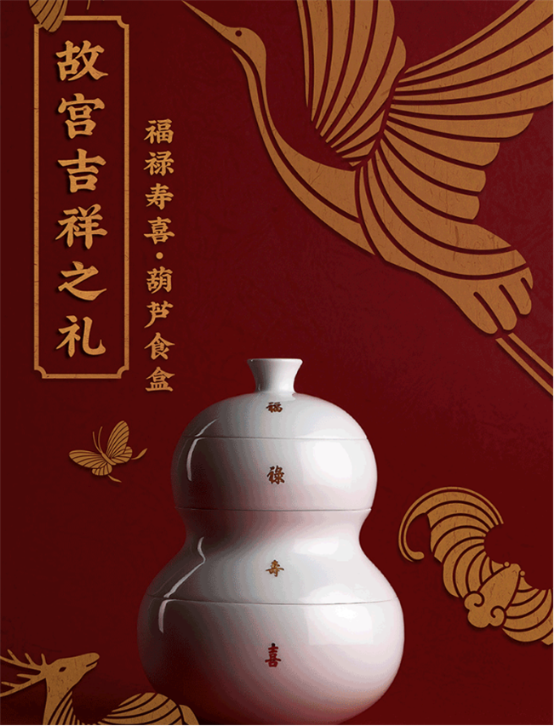 故宫设计师在起初构想时,本着以象征中国吉祥如意的符号——葫芦,为造型基础,再结合上宫廷文化中不同的“福禄寿喜”,而诞生了这款实用性非常高的福禄寿喜葫芦食盒。同样,是IP符号与文化的相结合,故宫博物院也开始不断进步,从原有的网红文创打造思维,逐步开始以文化为主体,为消费者带来了有深度的产品。